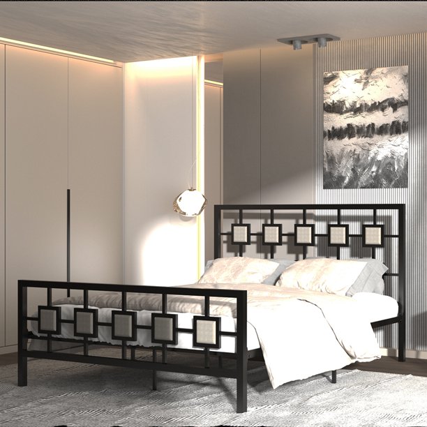 Farmhouse king bed frame with headboard and footboard.